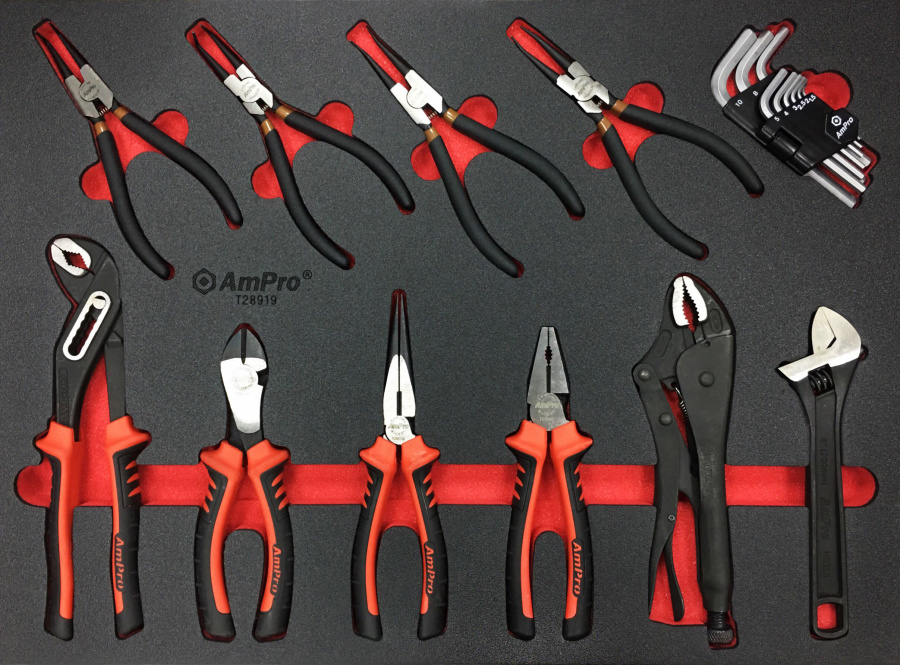 Приобрести T28919 Набор губцевый инструмент,съемники стопорных колец,шестигранники, 19пр. в мягком ложементе от компании AmPro (Тайвань) из раздела Ложементы мягкие (VA серия)